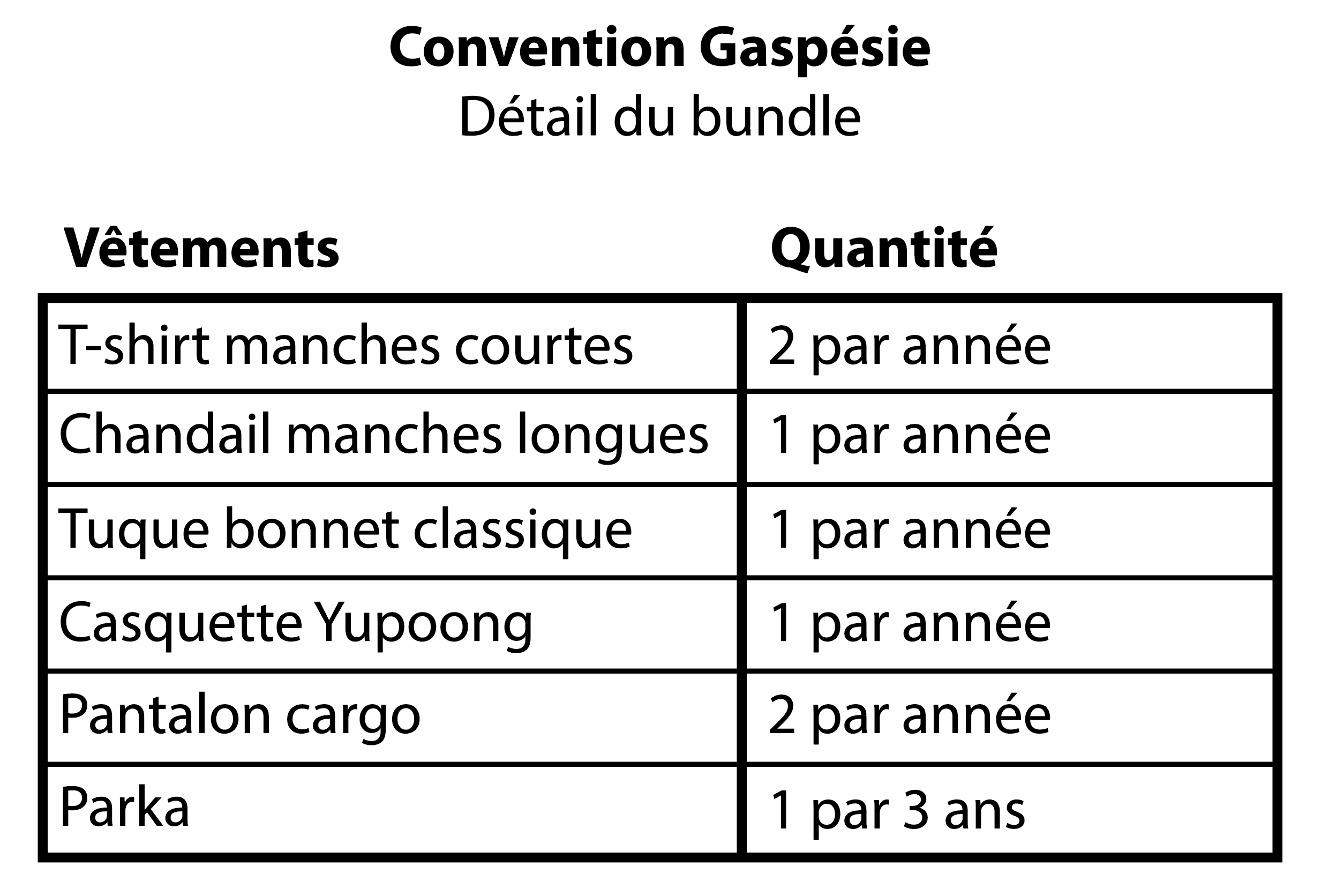 Vous avez droit à une allocation pour l’achat de vêtements. Cette allocation peut seulement être appliquée sur un groupe de vêtements prédéterminé que nous appelons bundle. Cette allocation vous est attribuée sous forme de coupon au montant du bundle que vous recevrez par courriel.