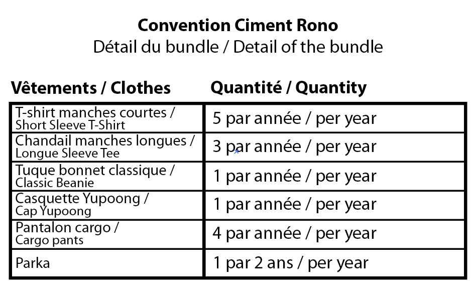 Le détail des quantités pour chaque vêtement qui doit se retrouver dans votre sélection.