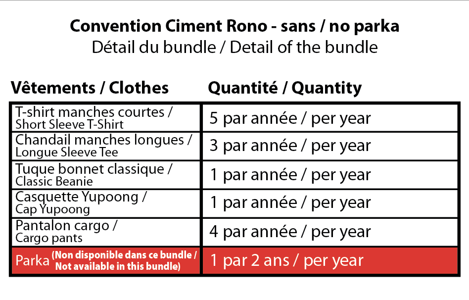 Le détail des quantités pour chaque vêtement qui doit se retrouver dans votre sélection.